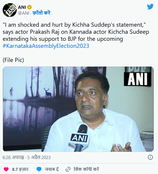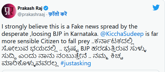 आपको बता दें कि कुछ दिन पहले प्रकाश राज ने किच्चा सुदीप को लेकर एक ट्वीट शेयर किया था। इस ट्वीट में उन्होंने लिखा था, ‘मेरा दृढ़ विश्वास है कि यह कर्नाटक में बीजेपी को हराने के लिए कुछ लोगों द्वारा फैलाई गई एक फेक न्यूज है। किच्चा सुदीप इसका शिकार नहीं होंगे, क्योंकि वे बहुत समझदार नागरिक है।‘ ऐसे में किच्चा के बीजेपी कैंम्पेनिंग के फैसले उन्हें हैरान कर दिया है।